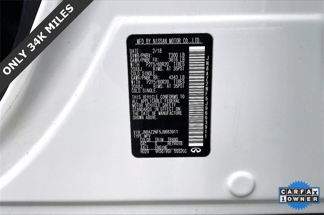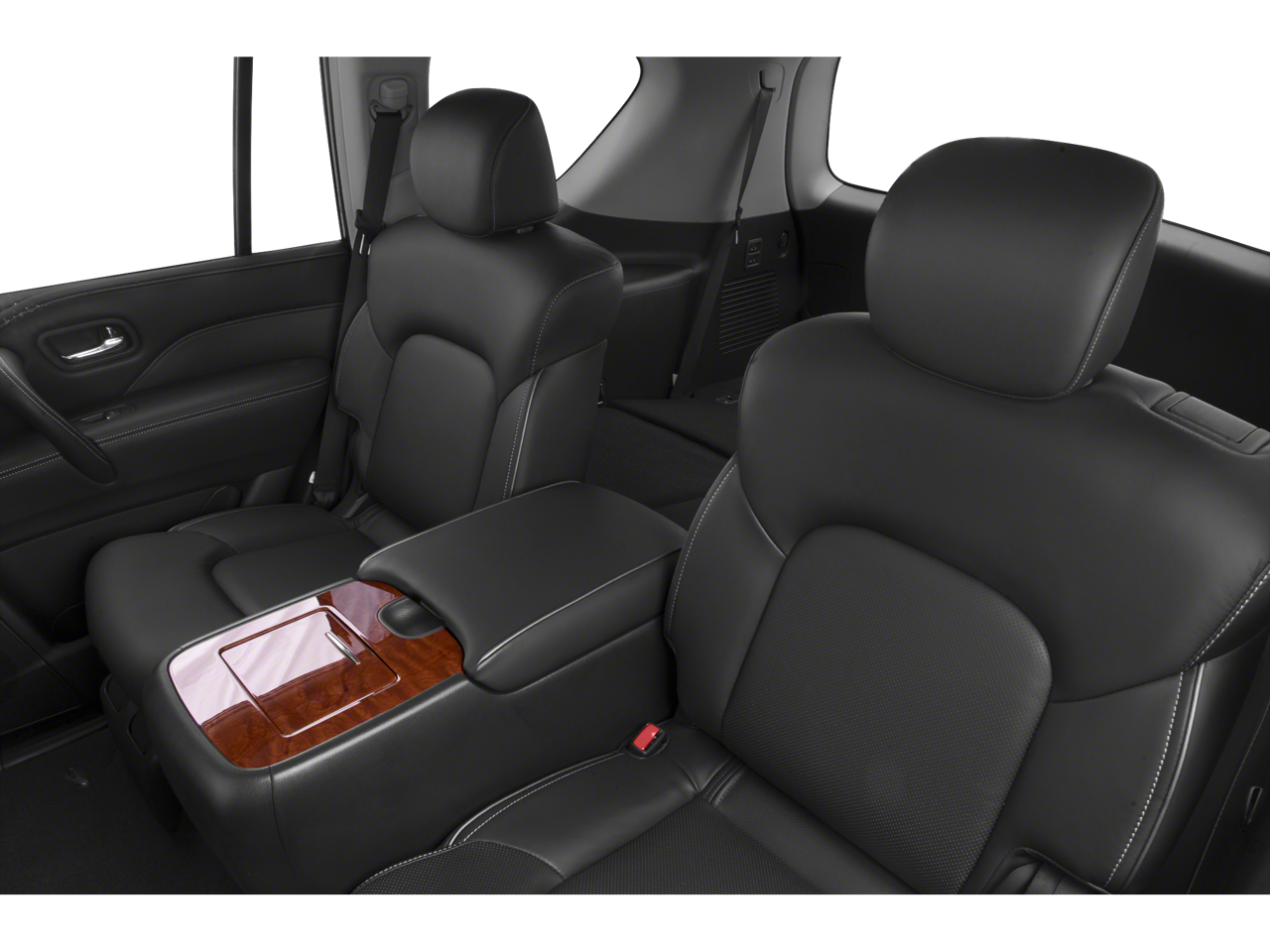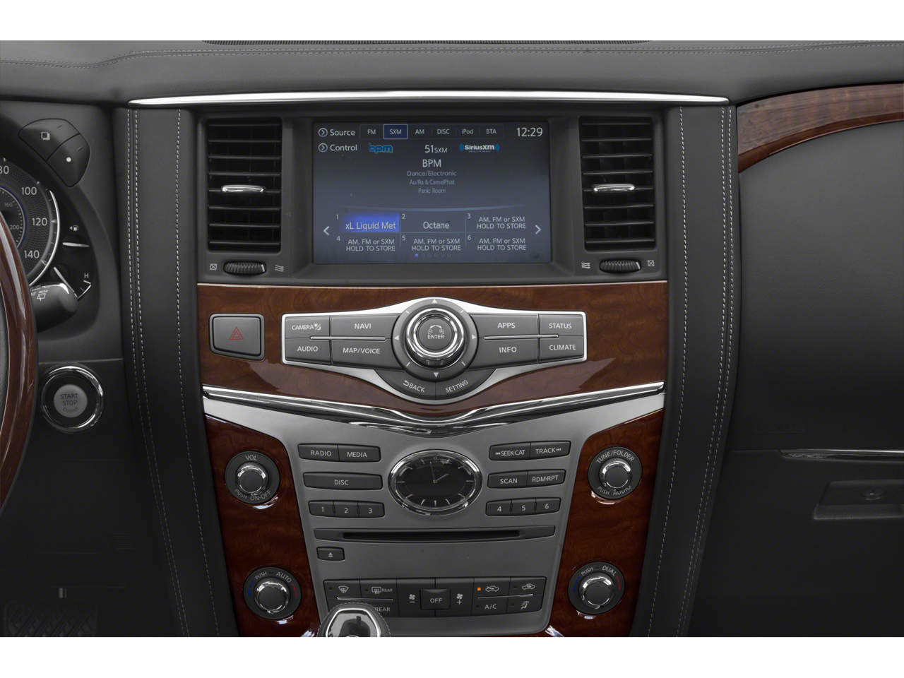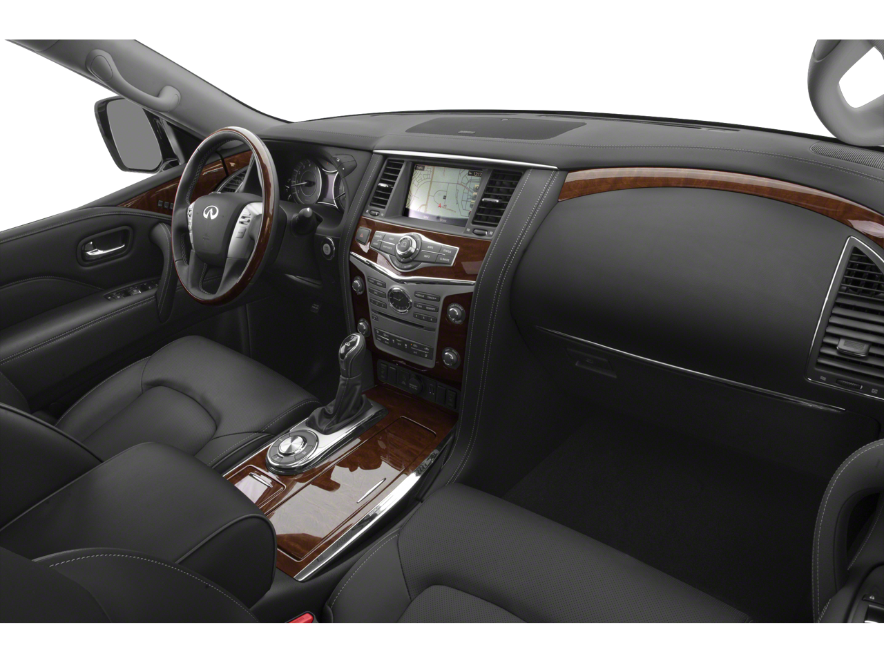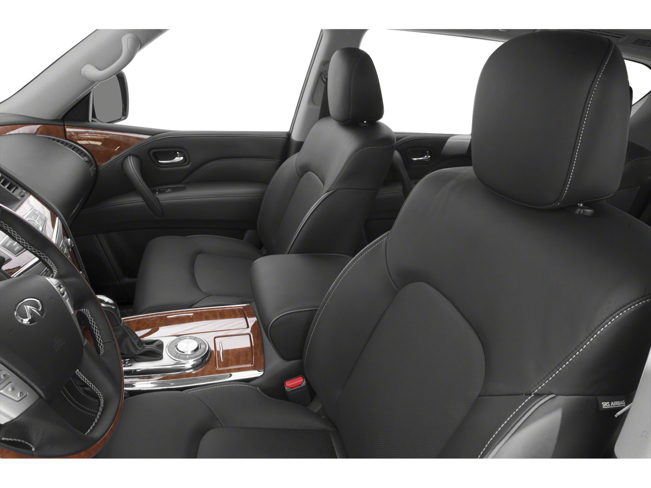 13 Speakers, 2.94 Axle Ratio, 3rd row seats: split-bench, 4-Wheel Disc Brakes, ABS brakes, Air Conditioning, Alloy wheels, AM/FM radio: SiriusXM, Anti-whiplash front head restraints, Auto High-beam Headlights, Auto tilt-away steering wheel, Auto-dimming door mirrors, Auto-dimming Rear-View mirror, Auto-leveling suspension, Automatic temperature control, Brake assist, Bumpers: body-color, Carpeted Cargo Mat/Cargo Net & First Aid Kit, CD player, Delay-off headlights, Driver door bin, Driver vanity mirror, Dual front impact airbags, Dual front side impact airbags, Electronic Stability Control, Emergency communication system: INFINITI Connection, Four wheel independent suspension, Front anti-roll bar, Front Bucket Seats, Front Center Armrest, Front dual zone A/C, Front fog lights, Front reading lights, Fully automatic headlights, Garage door transmitter: HomeLink, Genuine wood console insert, Genuine wood dashboard insert, Genuine wood door panel insert, Heated door mirrors, Heated Front Bucket Seats, Heated front seats, Heated steering wheel, Illuminated entry, INFINITI Radiant Illuminated Kick Plates, Leather Shift Knob, Leather steering wheel, Leather-Appointed Seats w/Stratford Burl Trim, Low tire pressure warning, Memory seat, Navigation System, Occupant sensing airbag, Outside temperature display, Overhead airbag, Overhead console, Panic alarm, Passenger door bin, Passenger vanity mirror, Power door mirrors, Power driver seat, Power Liftgate, Power moonroof, Power passenger seat, Power steering, Power windows, Radio data system, Radio: AM/FM/HD Single In-Dash CD/DVD Player w/MP3, Rain sensing wipers, Rear air conditioning, Rear anti-roll bar, Rear audio controls, Rear reading lights, Rear seat center armrest, Rear window defroster, Rear window wiper, Reclining 3rd row seat, Remote keyless entry, Roof rack: rails only, Roof Rail Crossbars, Security system, Speed control, Speed-sensing steering, Split folding rear seat, Spoiler, Steering wheel memory, Steering wheel mounted audio controls, Tachometer, Telescoping steering wheel, Tilt steering wheel, Traction control, Trip computer, Turn signal indicator mirrors, Variably intermittent wipers, Voltmeter, and Wheels: 20 x 8.0 Split 6-Spoke Aluminum-Alloy.
