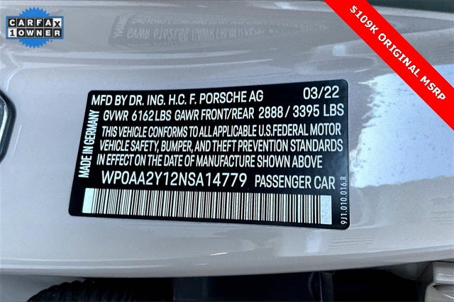 - Radio: Porsche Communication Management (PCM) -inc: online navigation, FM radio, Bluetooth® connection, audio inputs, mobile phone preparation w/Bluetooth® interface for telephone and music, RDS twin-tuner and diversity, voice control w/natural speech interaction, 3D navigation map, Porsche Connect, Porsche Vehicle Tracking System (PVTS), wireless Apple CarPlay and wired Android Auto, sound package plus w/10 speakers and a total output of 150 Watts, SiriusXM Satellite Radio (w/3-month trial) and HD Radio receiver