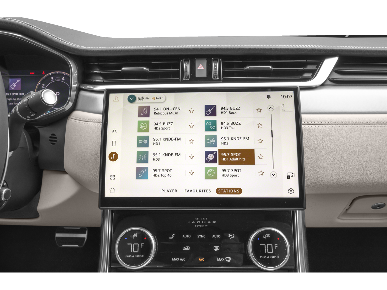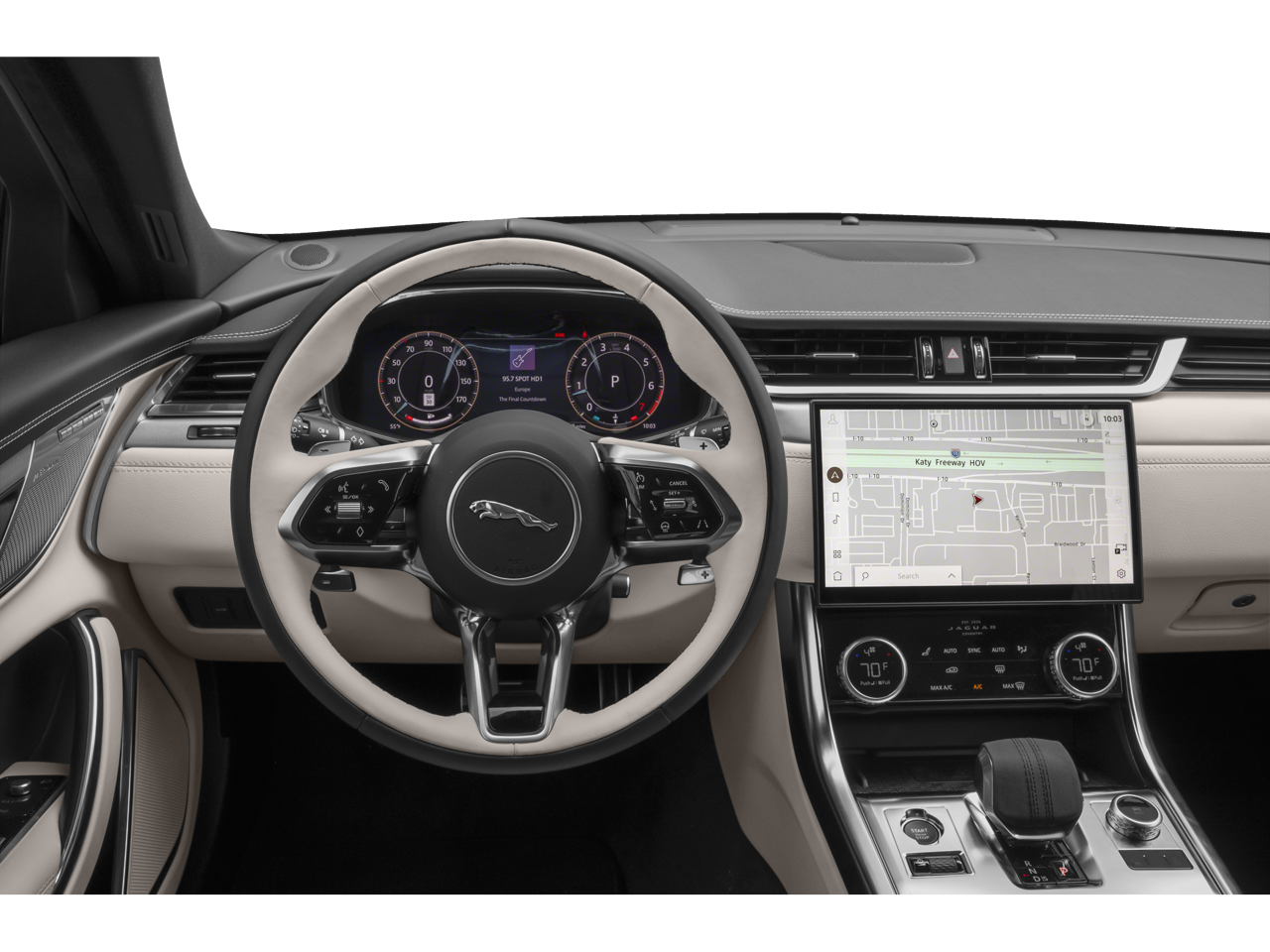 - Radio: Meridian 400W Sound System -inc: Pivi Pro w/11.4" capacitive touchscreen, Amazon Alexa, online pack w/data plan, Apple CarPlay, Android Auto, dynamic volume control, Bluetooth® connectivity, audio streaming, SiriusXM satellite radio, USB, 12V socket in center console, InControl Remote (including remote climate control, lock and unlock, beep and flash, SOS emergency call, Jaguar optimized assistance call and stolen vehicle locator) and wireless device charging